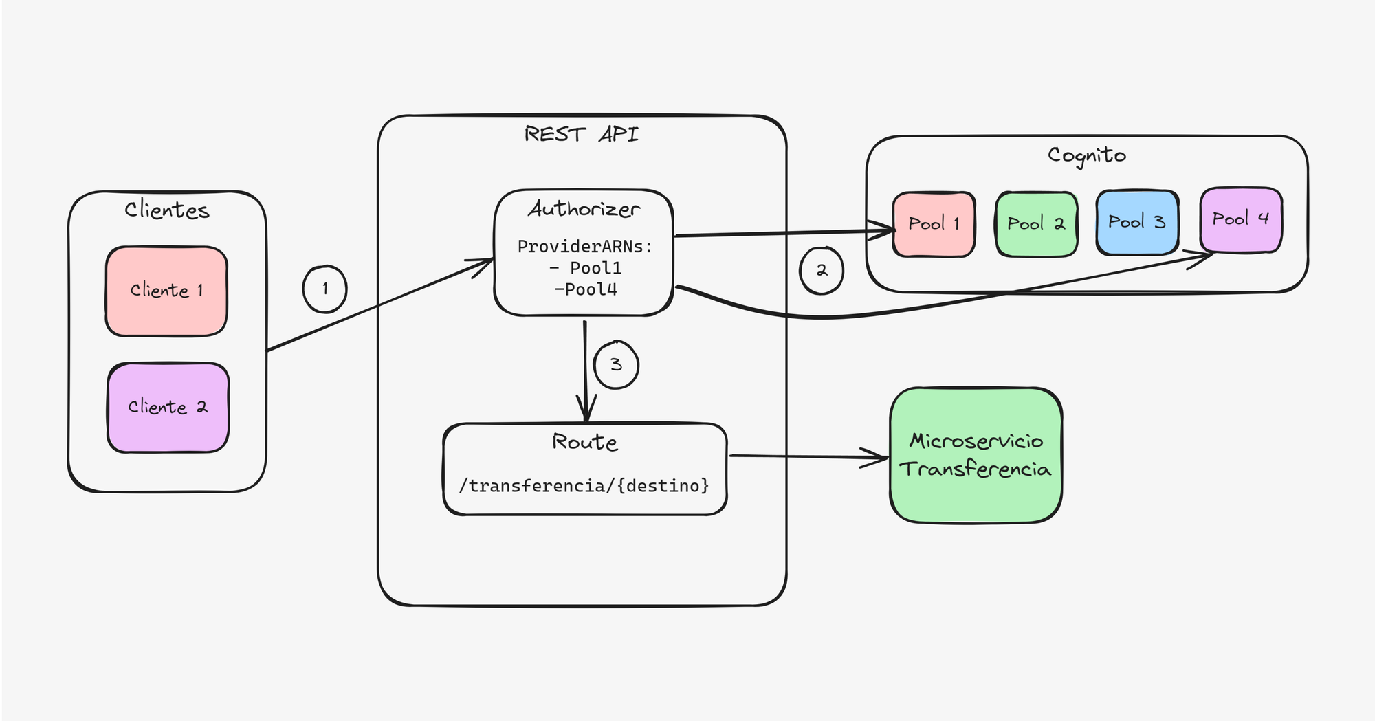 - Si el token es válido en alguno de los pools, se acepta el request y se lo envía al microservicio final.