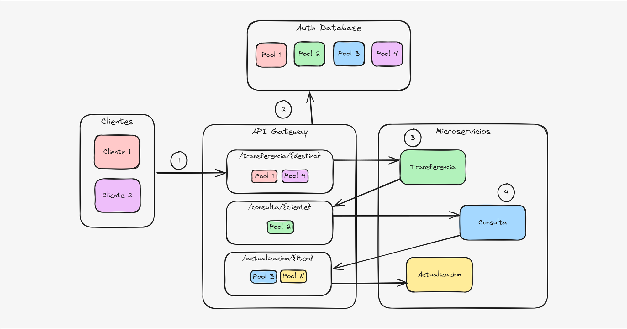 - Los microservicios se comunican con sus pares a través del mismo API Gateway y se autentican con sus pools individuales.