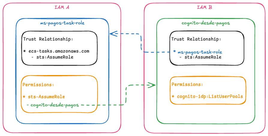 - La cuenta A permitirá que aquellos que asuman el role "ms-pagos-task-role" (en nuestro caso el microservicio de pagos) pueda asumir el role "cognito-desde-pagos" en la cuenta B. Denotado por la flecha verde.