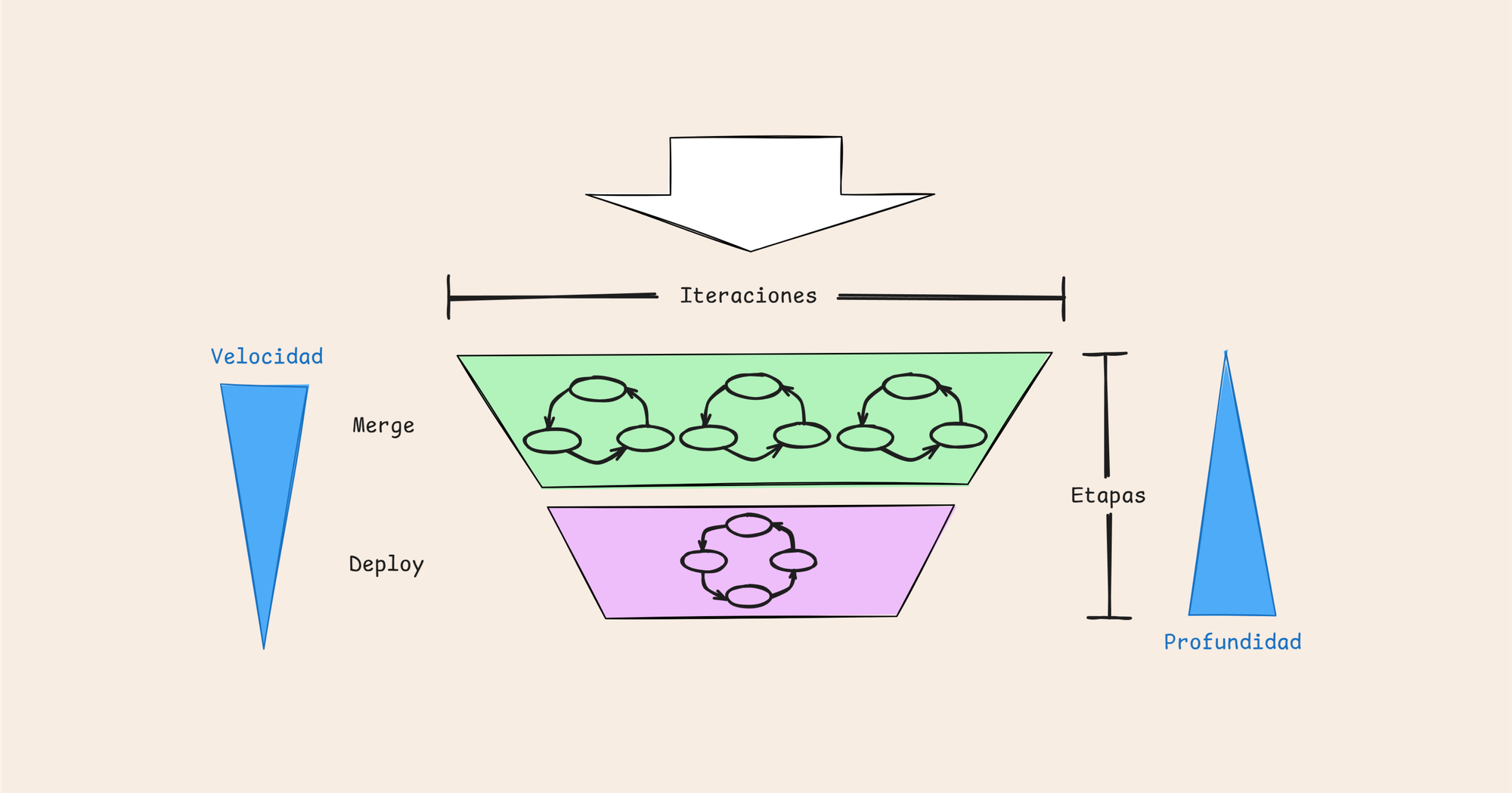 En el siguiente gráfico vemos el comportamiento típico de los dos tipos de pipelines en funcionamiento, donde aquellas que tienen como objetivo validar integraciones al repositorio son más rápidas y superficiales con feedback rápido. Mientras que las dedicadas a validar despliegues son más profundas y por ende más lentas.