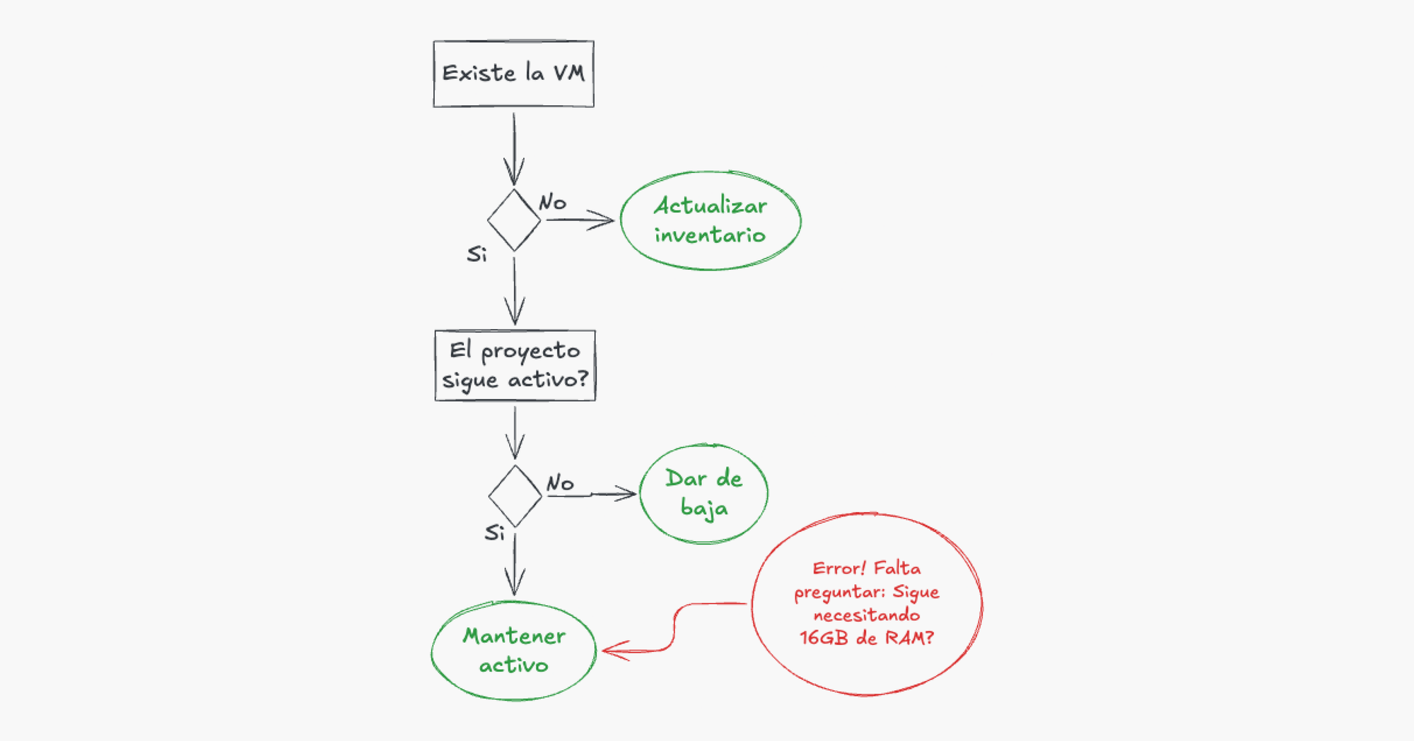 El problema es que para el primer caso de la máquina virtual X no se tuvo en cuenta que el proyecto X que aún sigue activo, ya no necesita 16GB de RAM para su suite de tests y que con un poco más de 2GB de RAM es suficiente para que siga operando. Aquí vemos que para lograr un inventario correcto, es necesario un proceso mucho más profundo de búsqueda de información que no solo implica involucrar a un desarrollador del proyecto (lo cual cuesta tiempo y por ende dinero) que tal vez ni esté al tanto del performance que necesita su ambiente de desarrollo, sino un cambio total de la forma de hacer no solo el inventario sino de manejar la limpieza de nuestros activos.