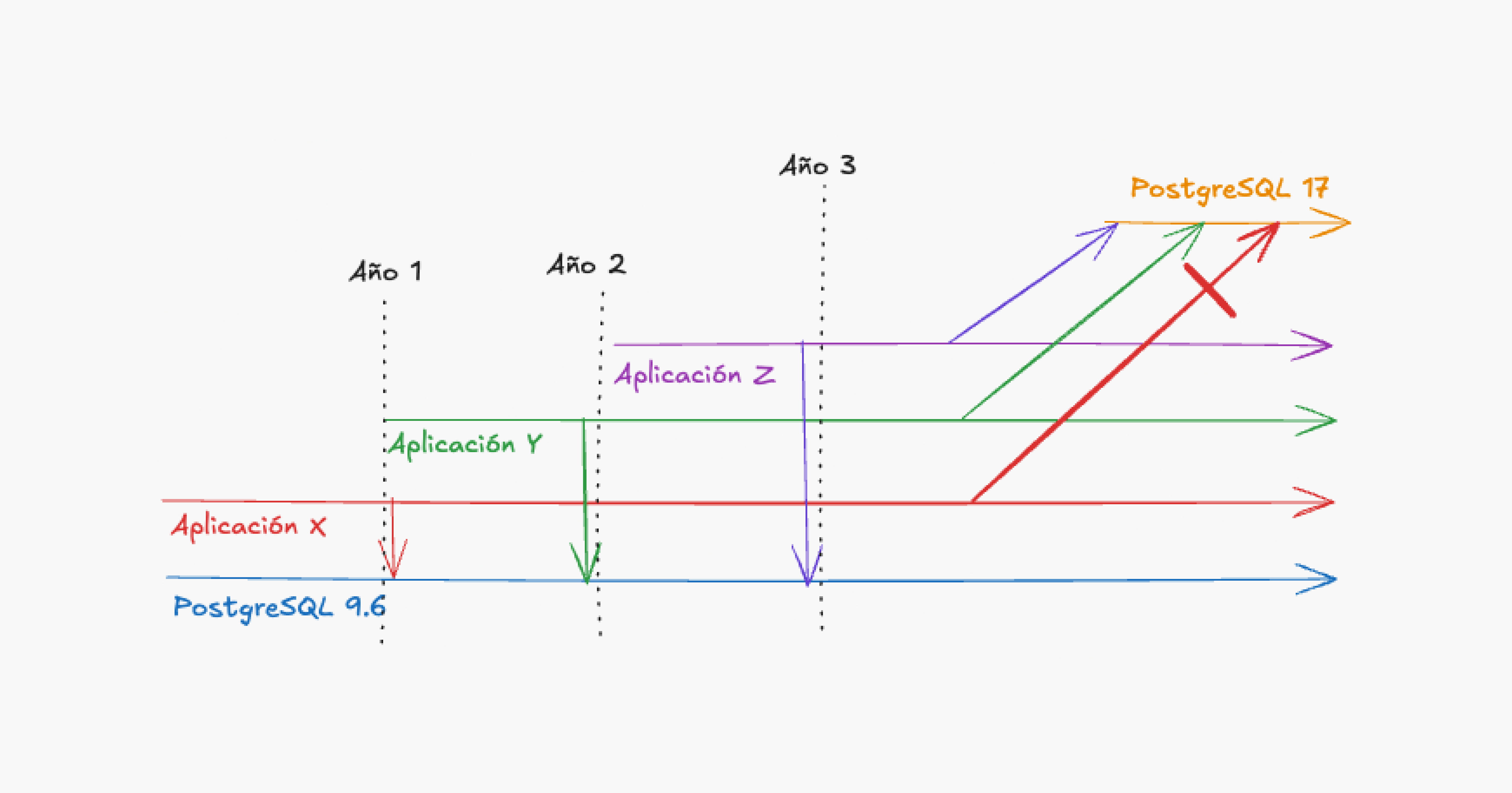 - Un par de meses después se intenta actualizar la versión del PostgreSQL a la 17, tanto Z como Y funcionan correctamente con esta versión, pero la aplicación X no lo hace, se decide no actualizar.