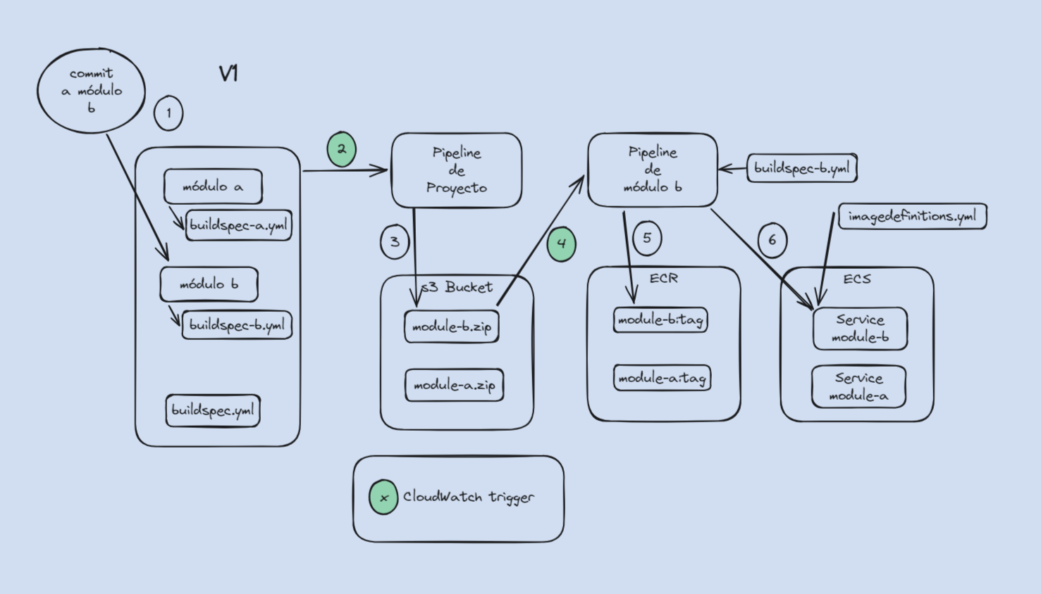 - Esto se soluciona haciendo un refactor de dependencias y moviendo la compilación del módulo a su propio pipeline. Con este esquema, el pipeline principal solo se limita a detectar los microservicios que cambiaron y envía el código fuente como .zip a través de AWS S3 a su pipeline específico, el cual tiene su propio archivo buildspec.yml. De esta forma, el pipeline principal se ejecuta cada vez que hay un cambio, pero al ser solo un chequeo sin compilación, su duración es muy corta. Este esquema se puede ver en el siguiente diagrama.