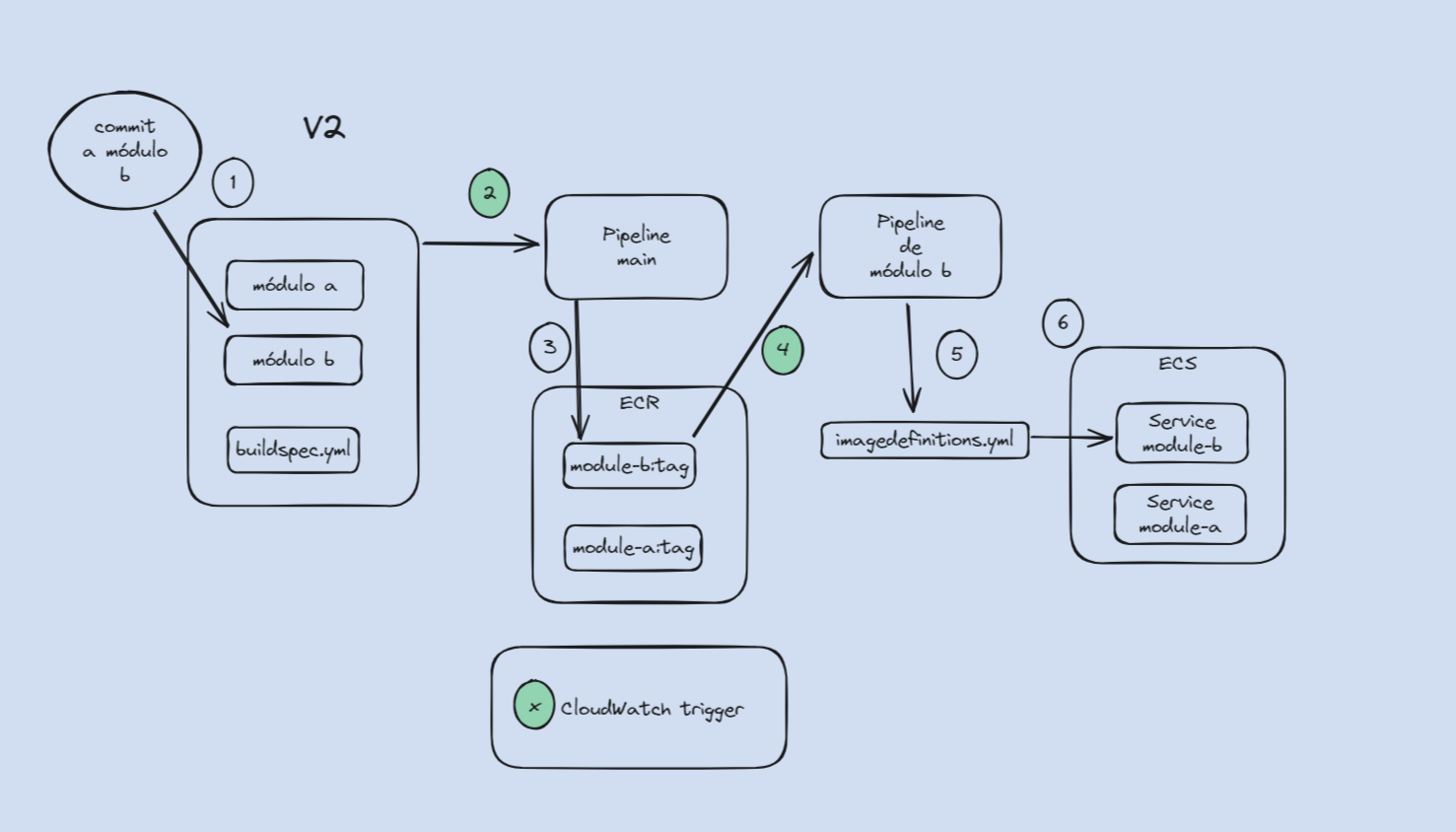 4. Las imágenes Docker en el ECR activan pipelines dedicados a cada módulo.