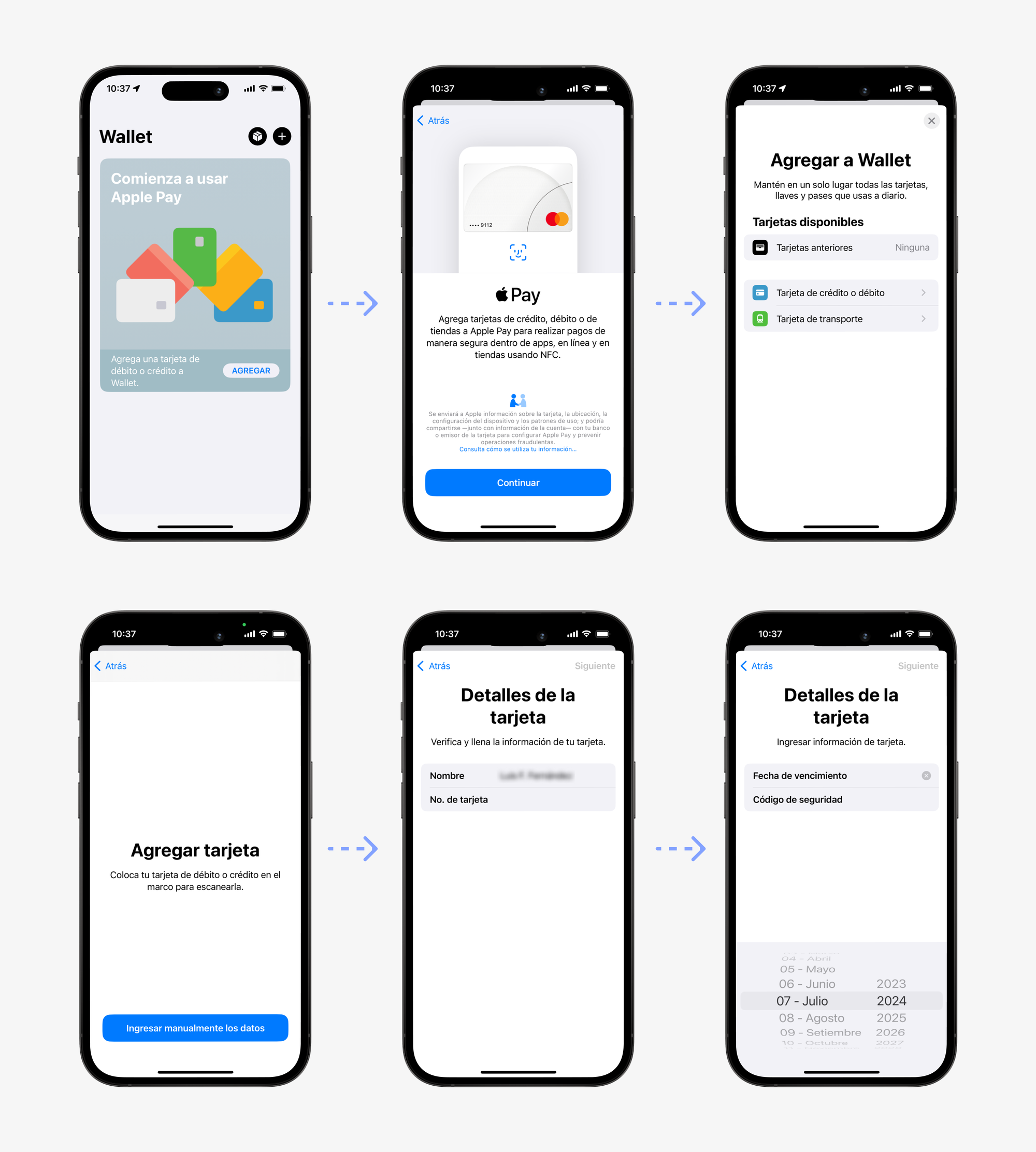 Para agregar tus tarjetas de crédito o débito utiliza la aplicación Wallet en tu dispositivo Apple. Esto se hace escaneando la tarjeta con la cámara del dispositivo o ingresando los detalles manualmente.