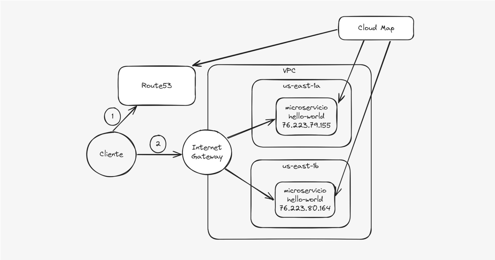 Dijimos que una desventaja del esquema 1 era el hecho de que las IP públicas no son estables, esto se soluciona con Cloud Map, el cual hace de intermediario entre ECS y Route53 para reflejar cambios en las IPs del backend en los registros DNS del servicio.