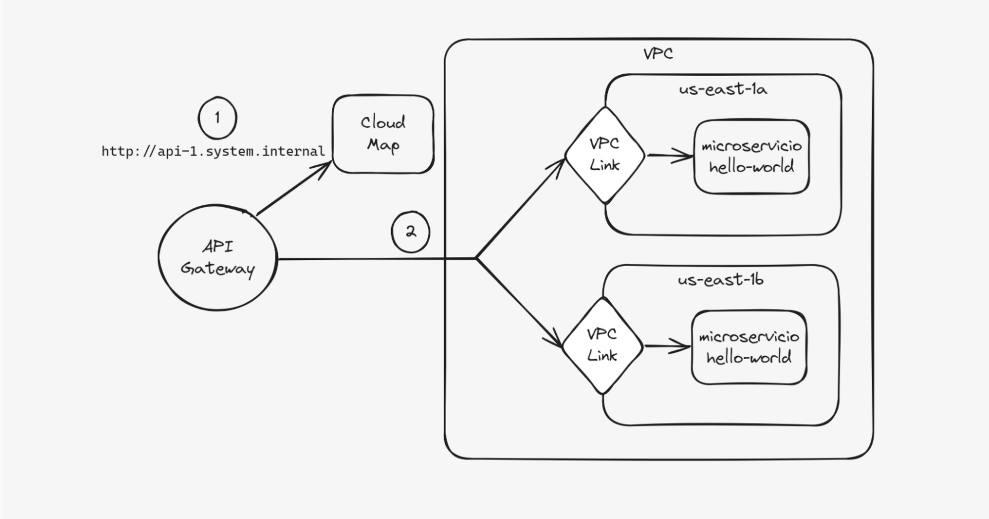 - Se tiene el servicio en ECS configurado con el siguiente DNS de service discovery: api1.system.internal