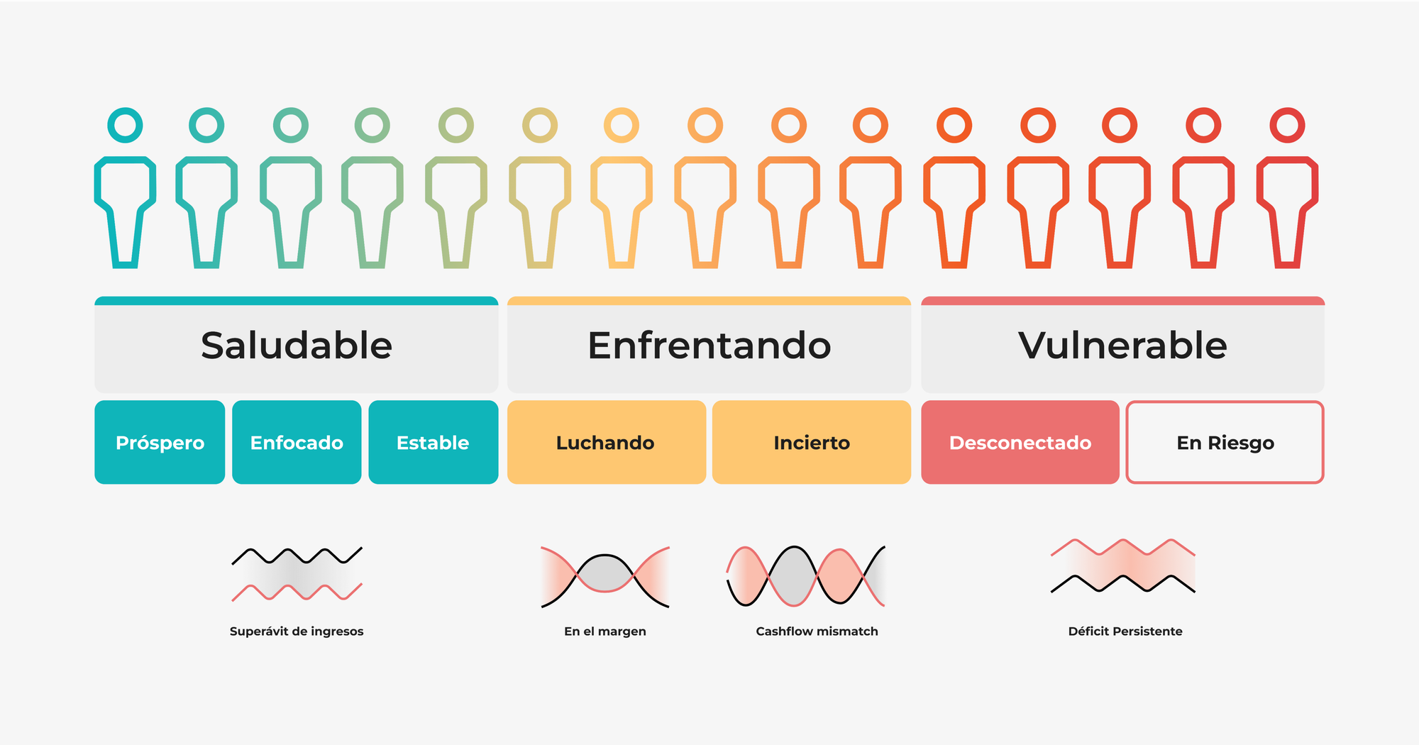 Para complementar este concepto, creamos una paleta de colores que incluye el verde, amarillo y rojo, formando una gradación que recuerda a un grafico de barras ascendente. Este esquema cromático se inspira en estudios sobre salud financiera realizados por el Center for Financial Services Innovation (CFSI), y refleja de manera clara y visual cómo la situación financiera puede variar desde un estado vulnerable (rojo), hasta uno saludable (verde).